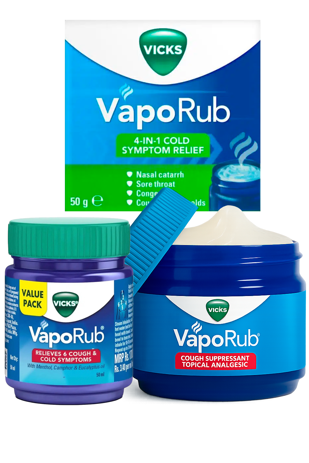 Vicks VapoRub 4-in-1 Cold Symptom Relief is an ointment for temporary relief of symptoms of cough, cold and stuffy nose.