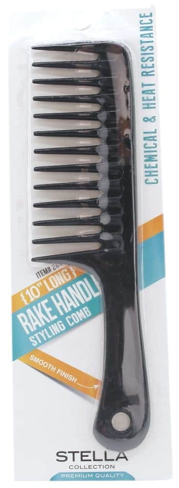 Stella Collection 10" Rake Handle Styling Comb is a large styling comb in black that is perfect for those with thick and long hair. The comb is wide-toothed with slightly rounded teeth that do not scratch or irritate the scalp, and is also made of heat-resistant plastic, which makes the comb ideal for use during blow-drying. This is model 2441.